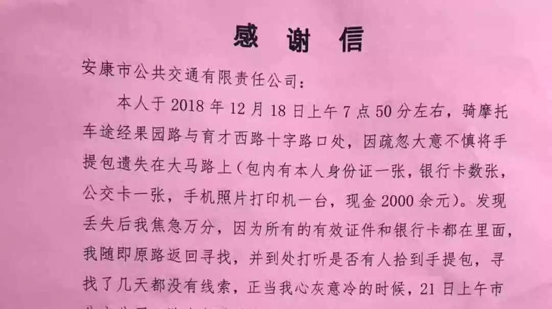 據(jù)失主吉某介紹,她是在12月18日早上的7點(diǎn)50分左右,騎摩托車途徑果園路與育才西路十字路口處,不慎將手提包遺失在馬路上。發(fā)現(xiàn)包丟失之后焦急萬(wàn)分,隨即原路返回尋找,并四處打聽(tīng)是否有人拾到手提包,尋找了幾天都沒(méi)有線索,正當(dāng)她心灰意冷的時(shí)候,接到了李師傅的電話。兩人確認(rèn)后,當(dāng)天下午,失主吉某來(lái)到安康市公交公司領(lǐng)取自己遺失的手提包。并將一面印有“拾金不昧品德高尚”的錦旗和一封感謝信送到公交公司車隊(duì)辦公室。